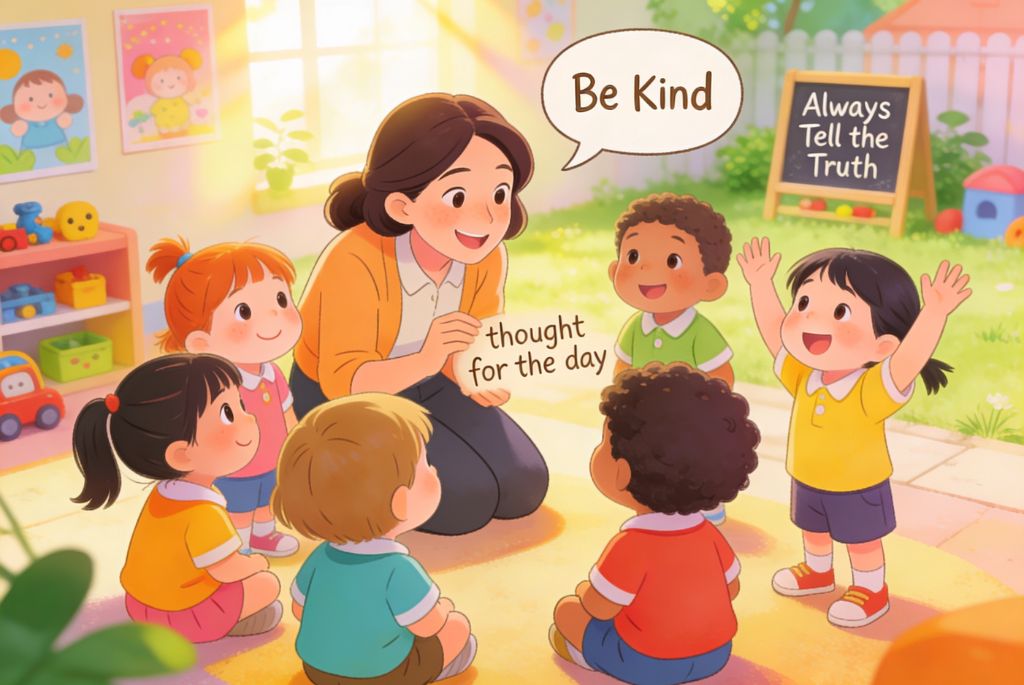Another helpful approach is linking the thought with classroom activities. A value like kindness can be connected to group work, helping classmates, or simple acts like sharing. When children see the same idea being followed during the day, it strengthens the impact of the morning thought.